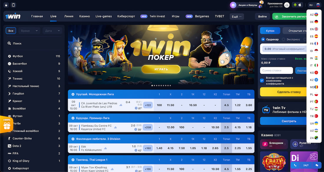 Букмекерская контора 1 Вин выделяется удобным и продуманным интерфейсом. Основные разделы находятся в зоне быстрого доступа, что позволяет мгновенно переключаться между лайв-ставками и прематчем. Процесс заполнения купона максимально прост и интуитивно понятен даже для начинающих игроков.